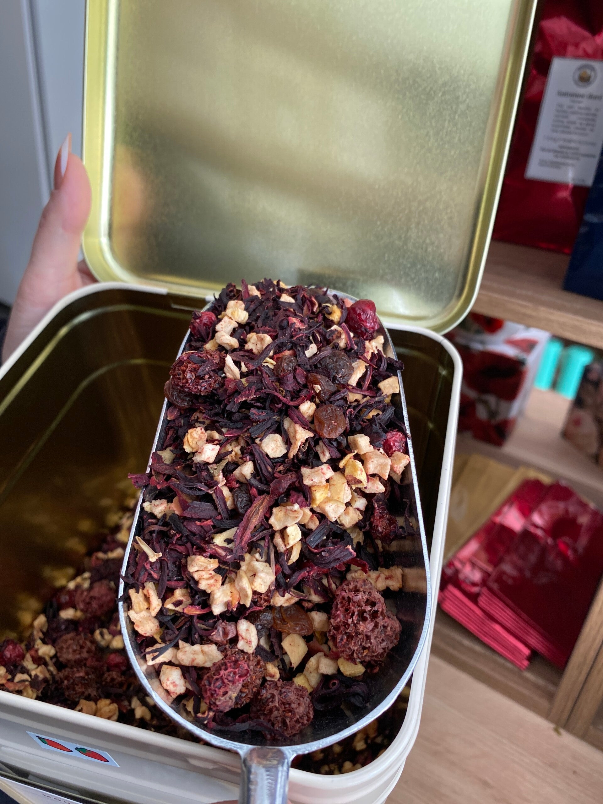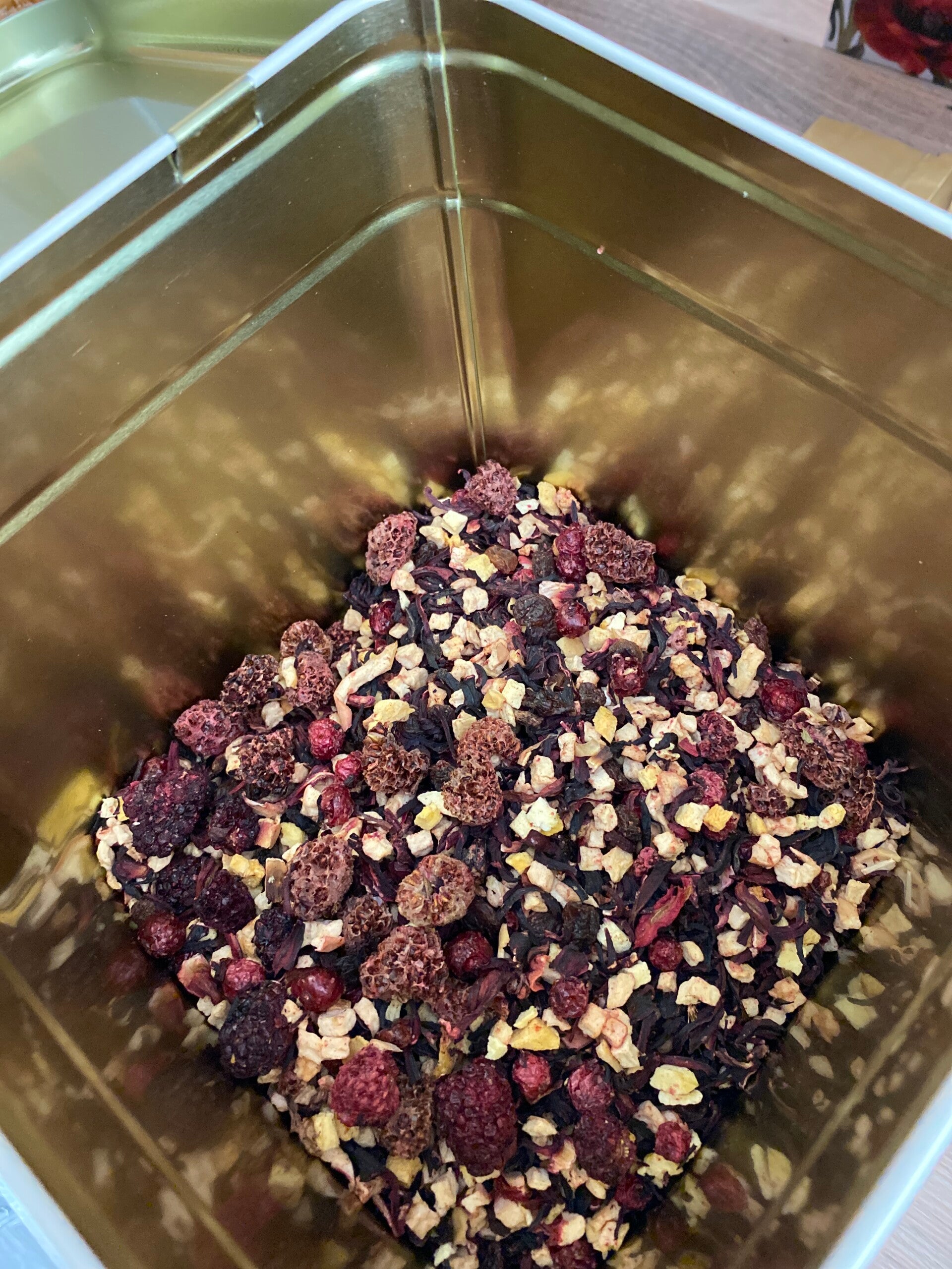 Ingrédients: hibiscus, raisins secs, pomme séchée, framboise