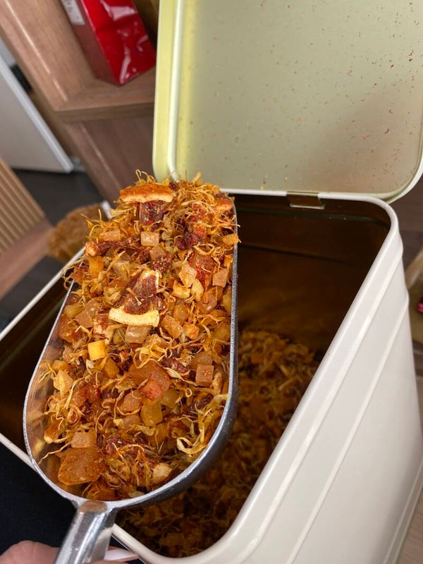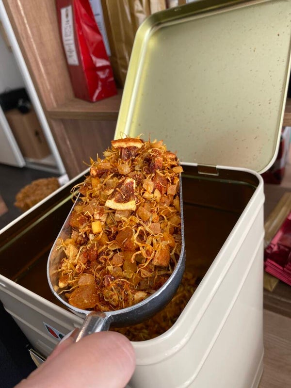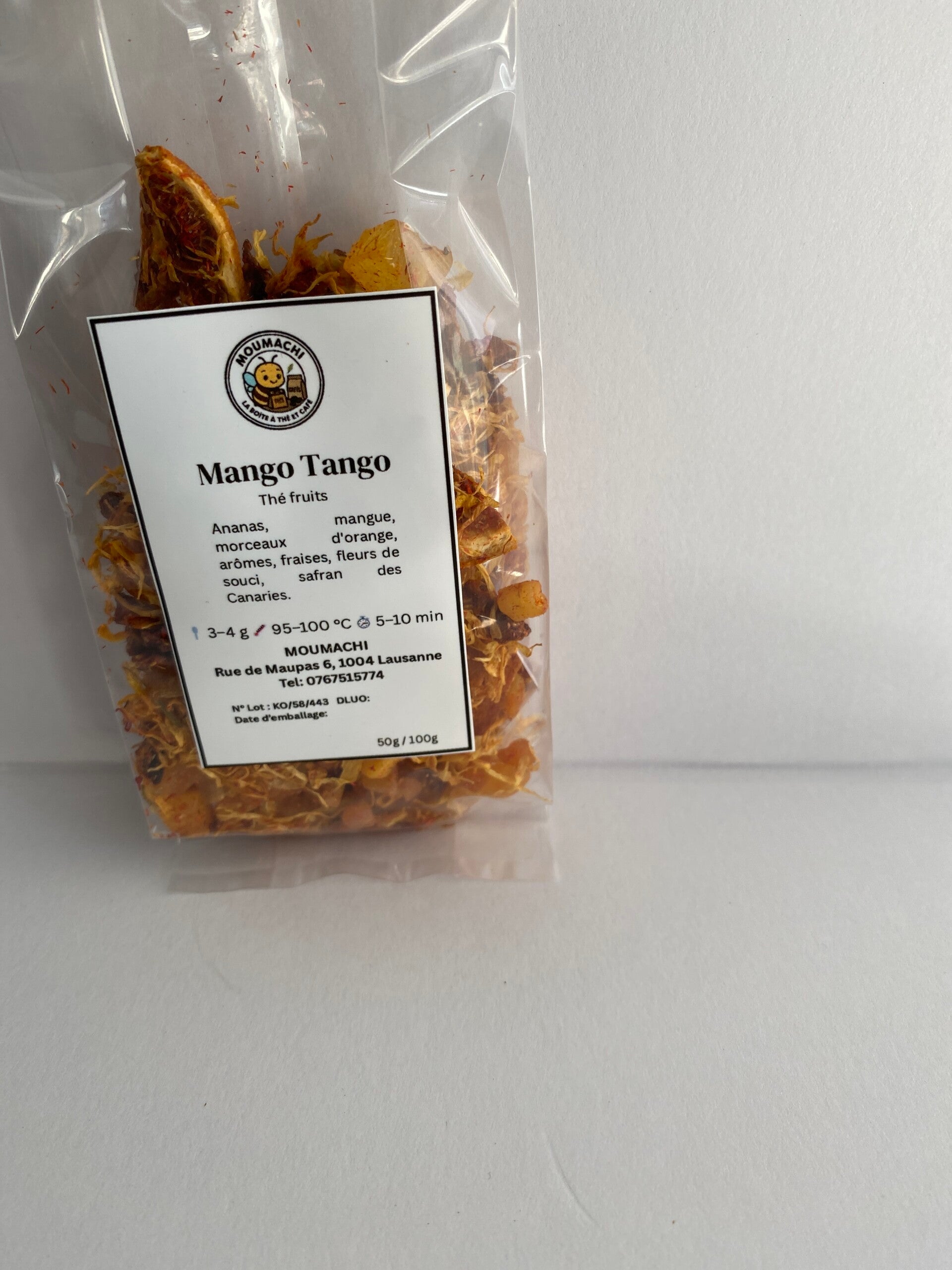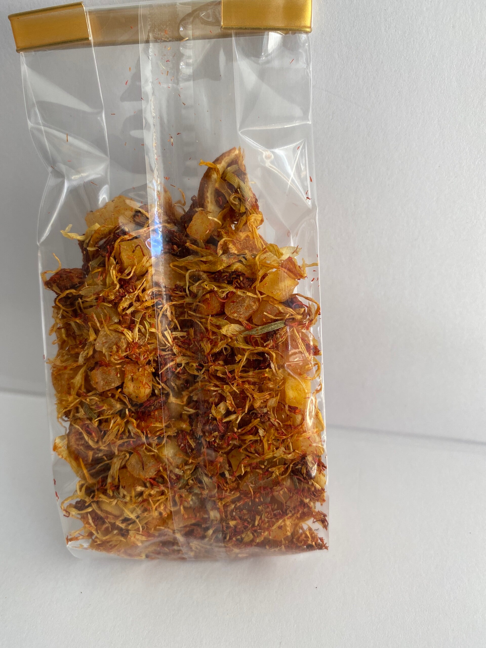 Ingrédients: ananas, mangue, morceaux d'orange, arôme, fraises, pétales de souci, safran des Canaries