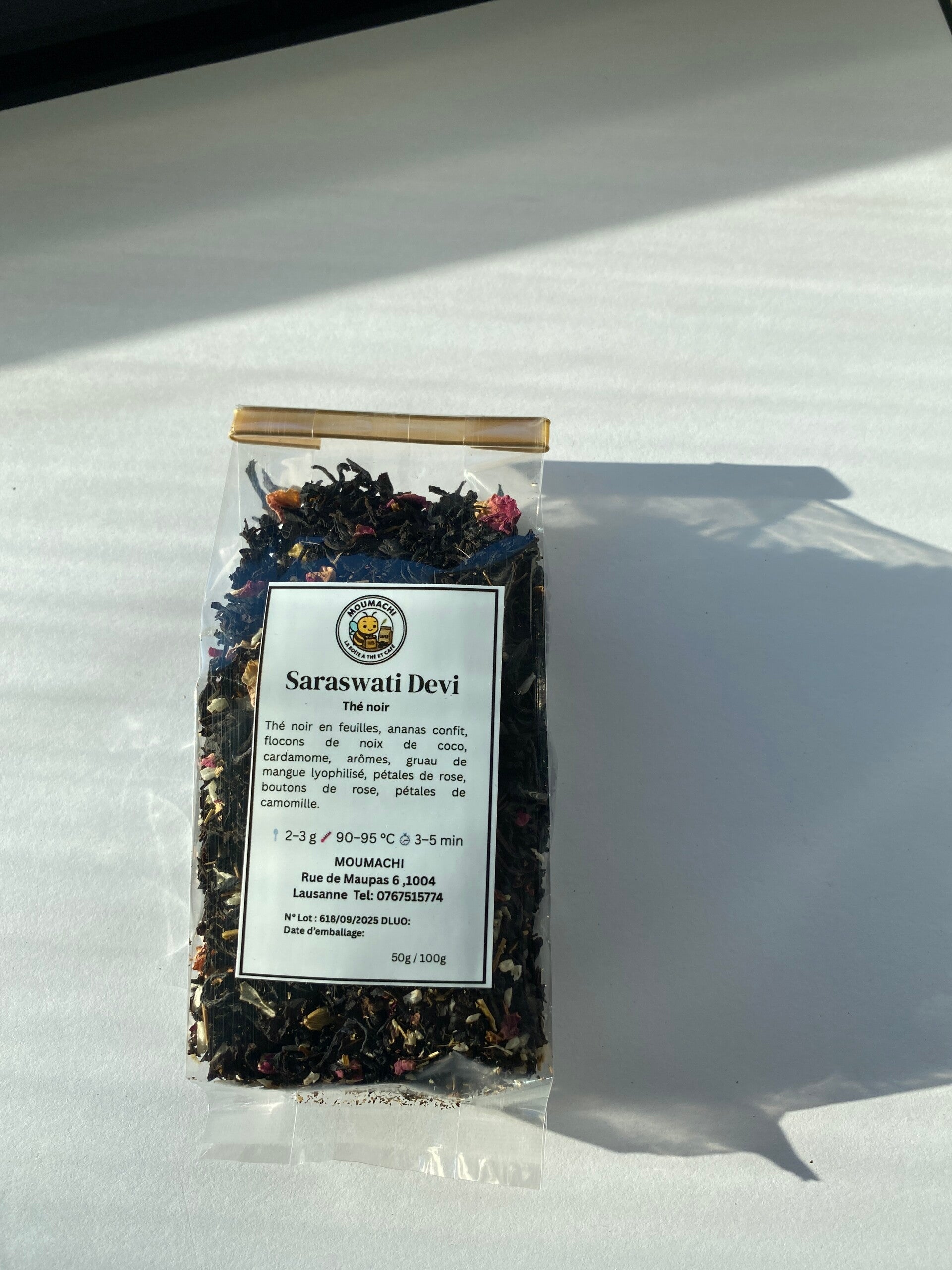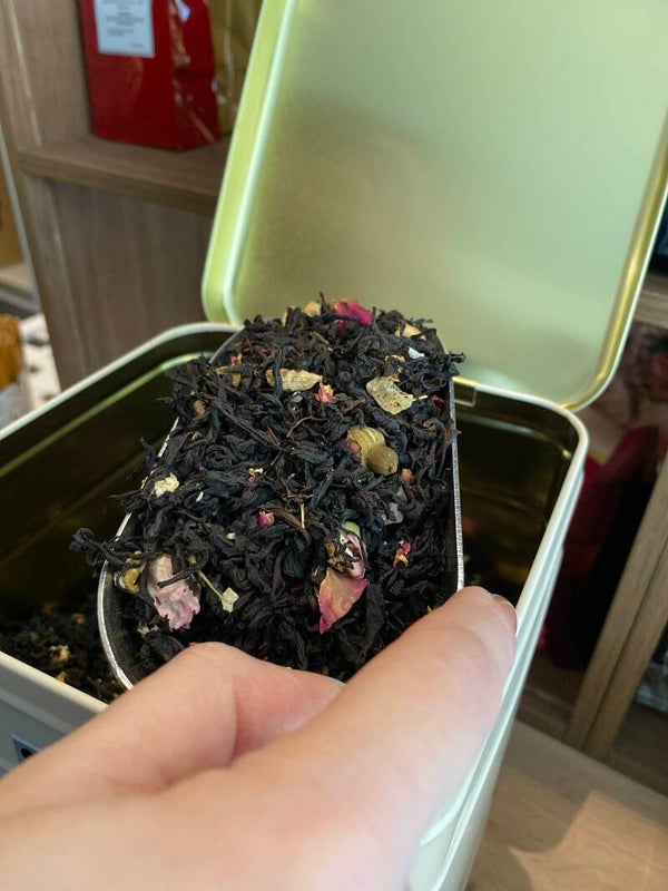 Ingrédients: thé noir en feuilles, ananas confit, copeaux de noix de coco, cardamome, arôme, mangue lyophilisée en éclats, pétales