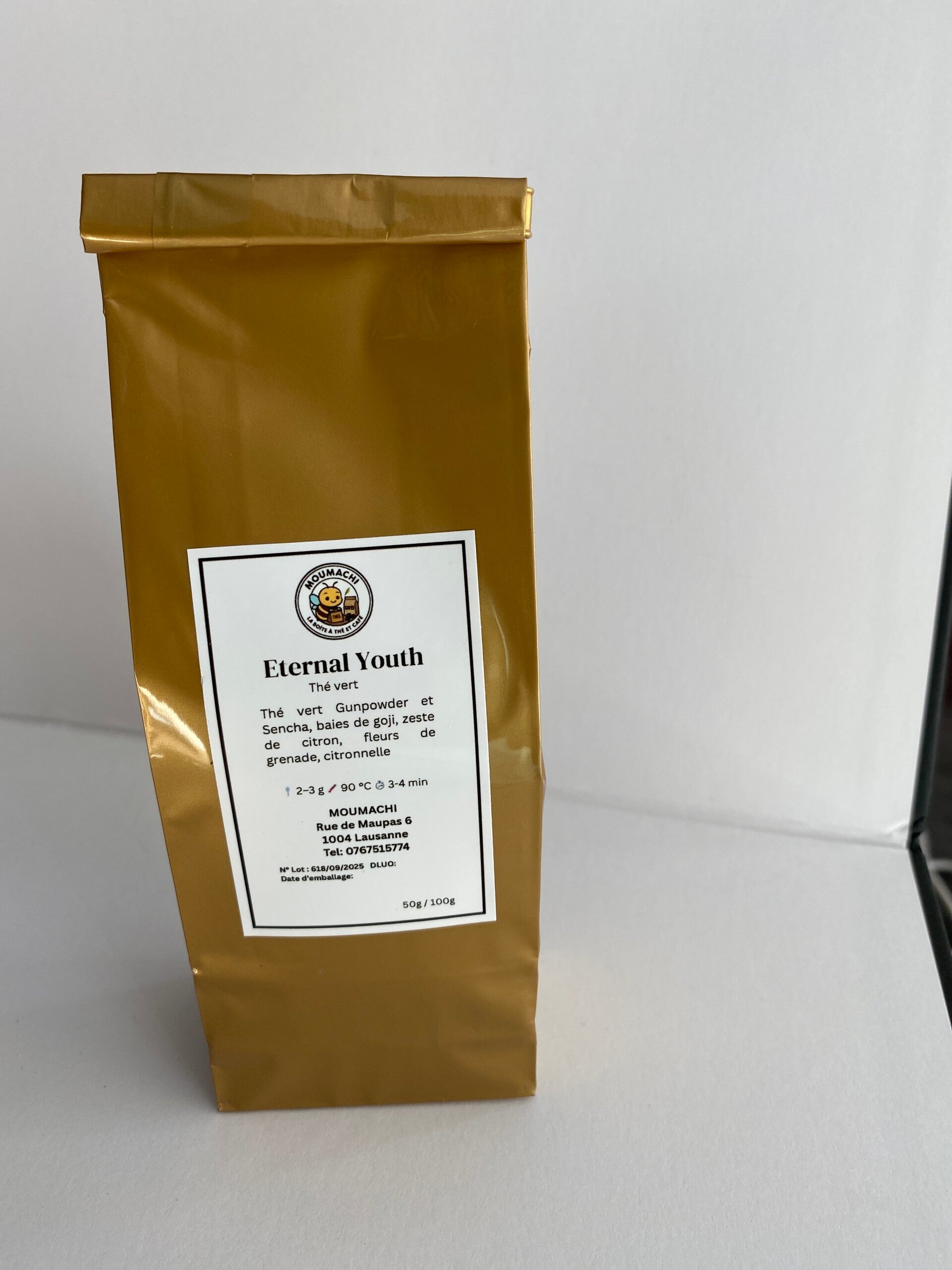 Le thé vert Jeunesse Éternelle est une riche source d'antioxydants. Il contribue à renforcer le système immunitaire et aide à ralentir le processus de vieillissement. Cette création associe des feuilles de thé vert Sencha et Gunpowder, sublimées par de la citronnelle et des écorces de citron. Les fleurs de grenade et les baies de goji viennent compléter ce mélange raffiné, offrant une saveur délicate et un arôme unique.